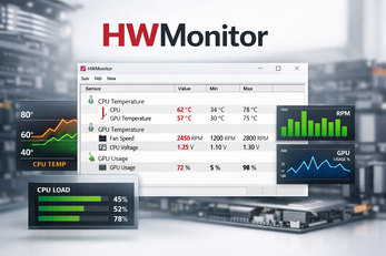 HWMonitor is a free hardware monitoring tool for Windows PCs. Use it to monitor CPU temperature, GPU temperature, fan speed, voltages, and power consumption in real time. Compatible with all modern Intel and AMD processors including Core Ultra, Ryzen 9000, and Ryzen AI series.